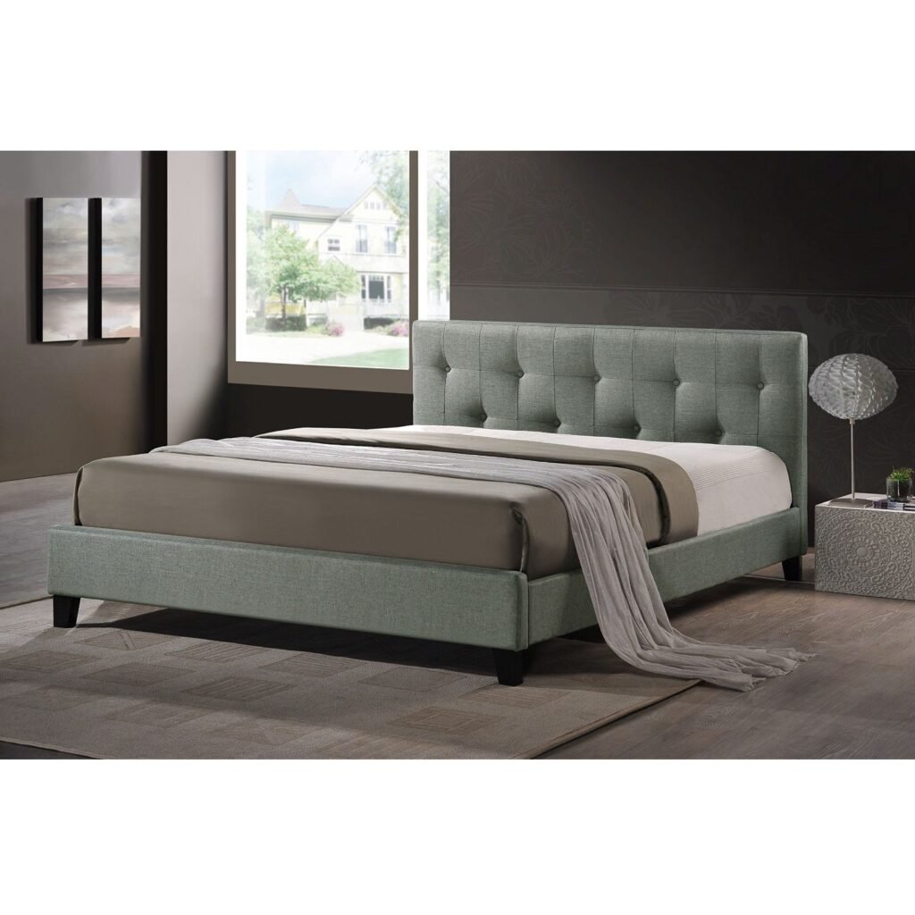 Queen size Gray Linen Upholstered Platform Bed with Button Tufted Headboard