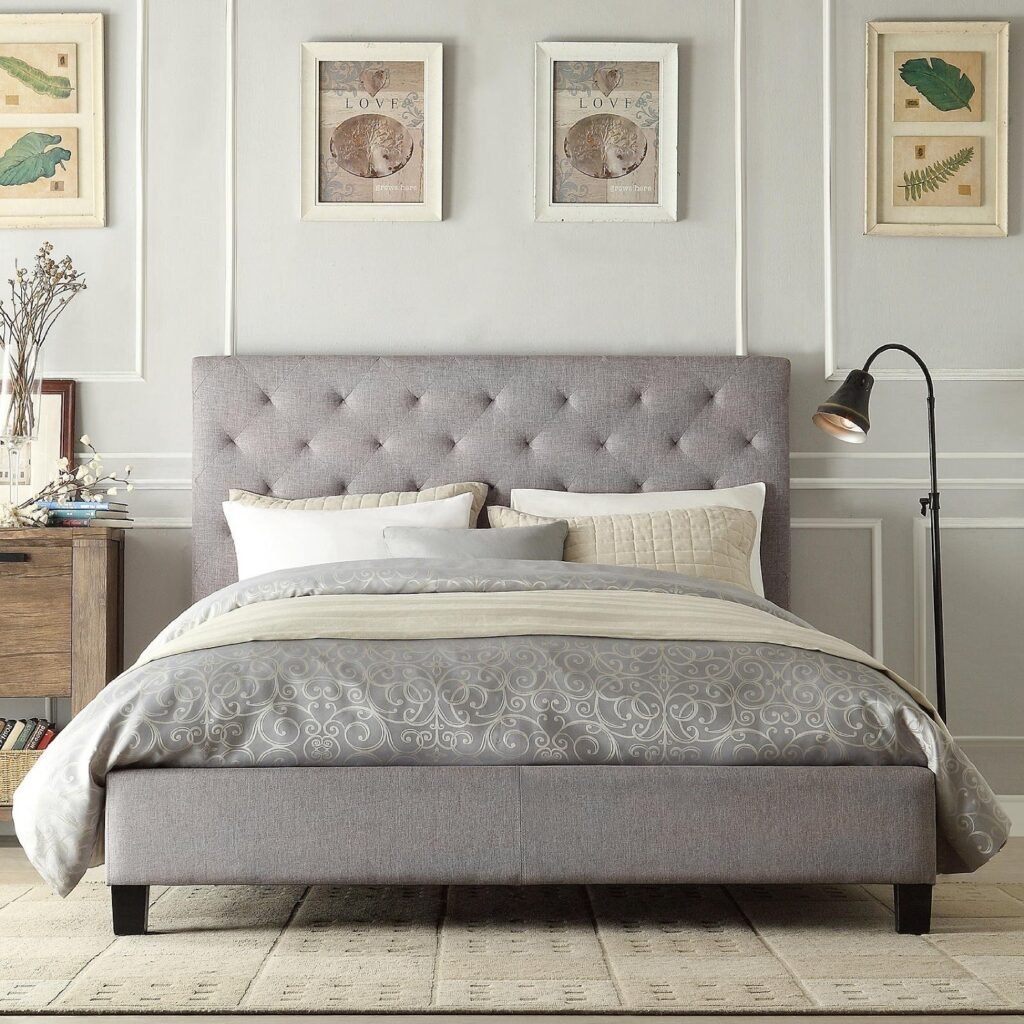 Queen size Grey Linen Upholstered Platform Bed with Button-Tufted Headboard