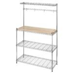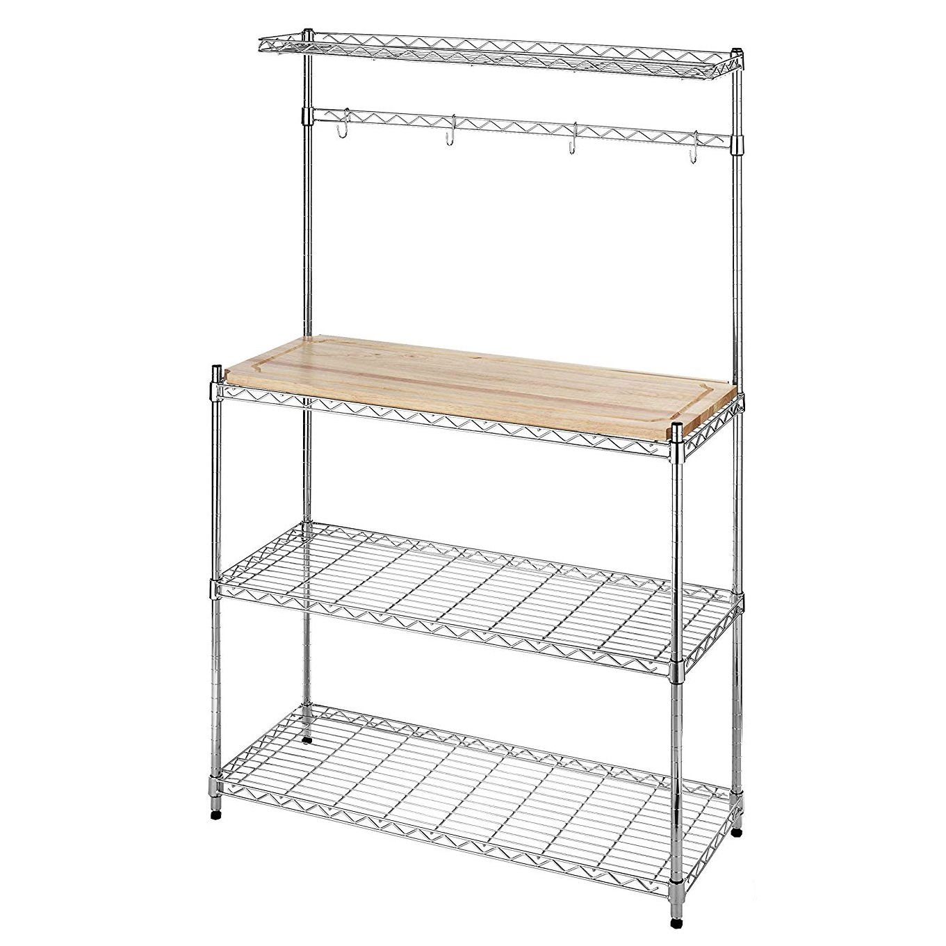 Keep your kitchen organized and everything in its place with this Modern Bakers Rack in Chrome Steel with Removable Wood Cutting Board. This rack is perfect for storing your pots and pans as well as your other cooking utensils. In addition there is a wood cutting board that is included. Kitchen Baker Rack Features Easy no tool assembly. Durable chromed metal construction. Wood cutting board included. Great for your kitchen or eve for use in the garage or office. Four accessory hooks included. Shelves are adjustable in 1″ increments.