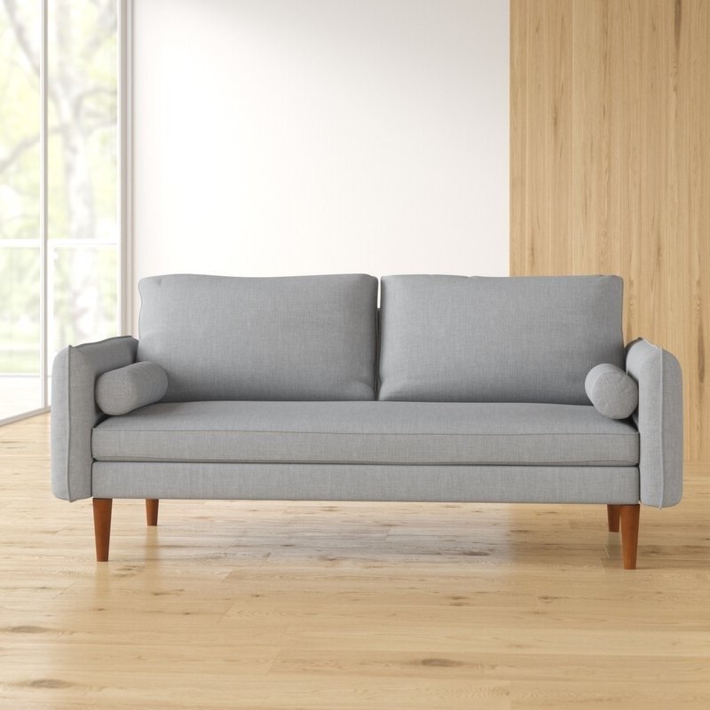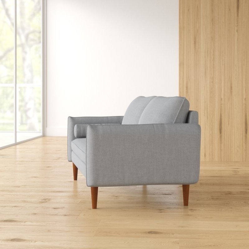 Modern style pairs with contemporary convenience to create this Modern Light Grey Fabric Upholstered Mid-Century Style Sofa, a must-have in any living room. Its splayed legs are crafted from wood, while its streamlined silhouette is wrapped in linen upholstery for a textural touch. A pair of included bolster pillows and button-tufted details on the back make this item even more inviting. It measures 32.3” H x 70.8” W x 33.8” D overall, featuring enough room to seat two people.