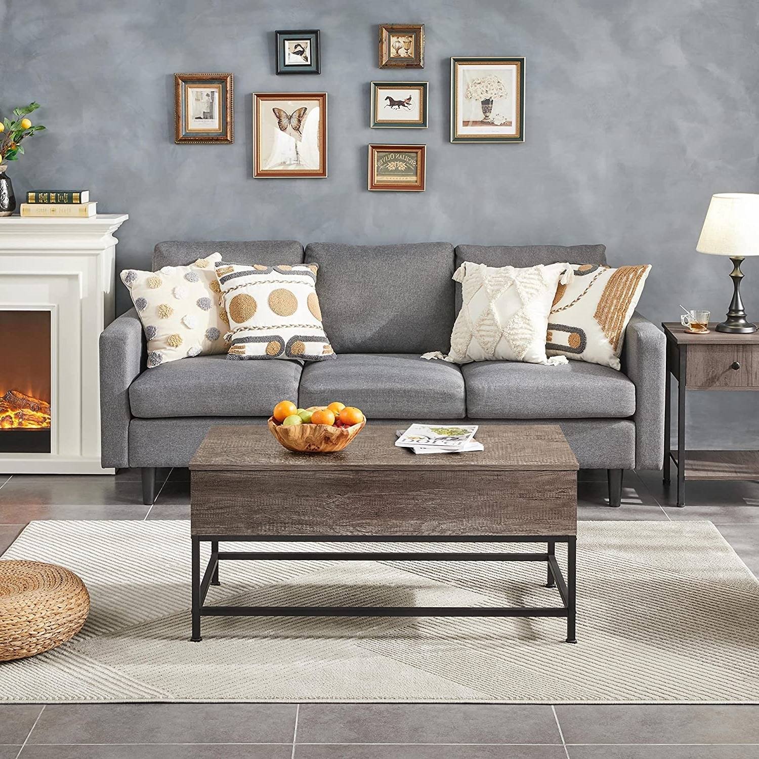 Design and functionality meet harmoniously with the Modern Metal Lift Top Coffee Table Sofa Laptop Desk with Rustic Taupe Wood Top. This functional living room table offers an abundance of storage to a small living room, great room, condo, family room or den. Crafted of CARP Phase 2 compliant MDF with a weathered finish and powder-coated metal, this lift-top coffee table sports a distinctly rustic industrial feel. The split tabletop consists of a gas lift top that can be elevated to 24” and a fixed surface. This smart design helps bring the tabletop to you and allows you to work or dine without leaning forward. Simple setup is required for this lift-top coffee table.
