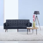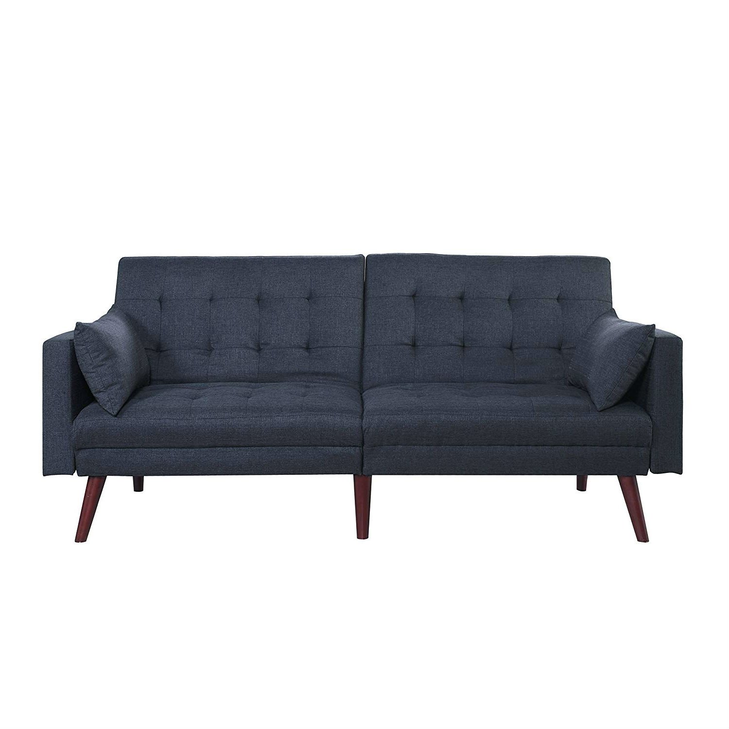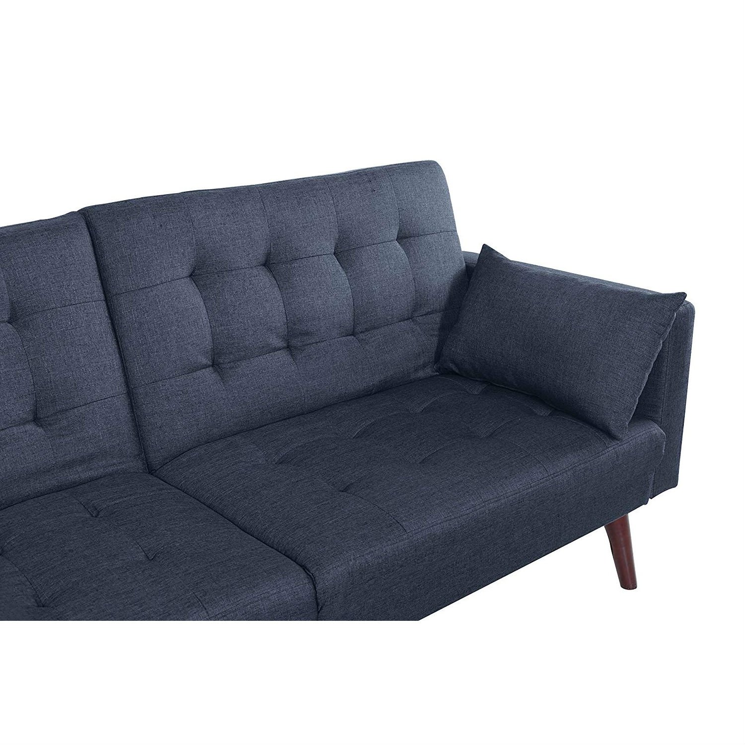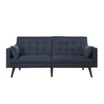 This Modern Mid-Century Sleeper Sofa Bed in Dark Blue Black Linen has modern linen splitback futon with fabric upholstery in various colors. Features tufted fabric with soft and durable seats and 2 bolster pillows in the same fabric.