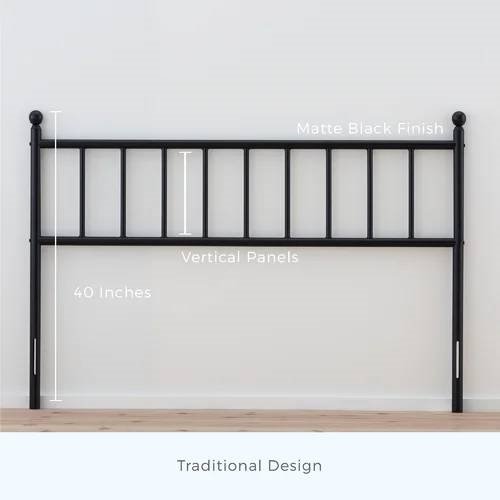 This Queen size Traditional Farmhouse Headboard in Matte Black Metal Finish helps complete your bedroom ensemble, with its sleek shape and traditional design. It’s made from metal in a black matte finish, and it has open vertical slats and decorative finials that fit well within your space — no matter the style of your room or its color palette. This headboard is 40″ tall when measured with both legs. Plus, you can easily mount it to your bed frame — all hardware and plates included.