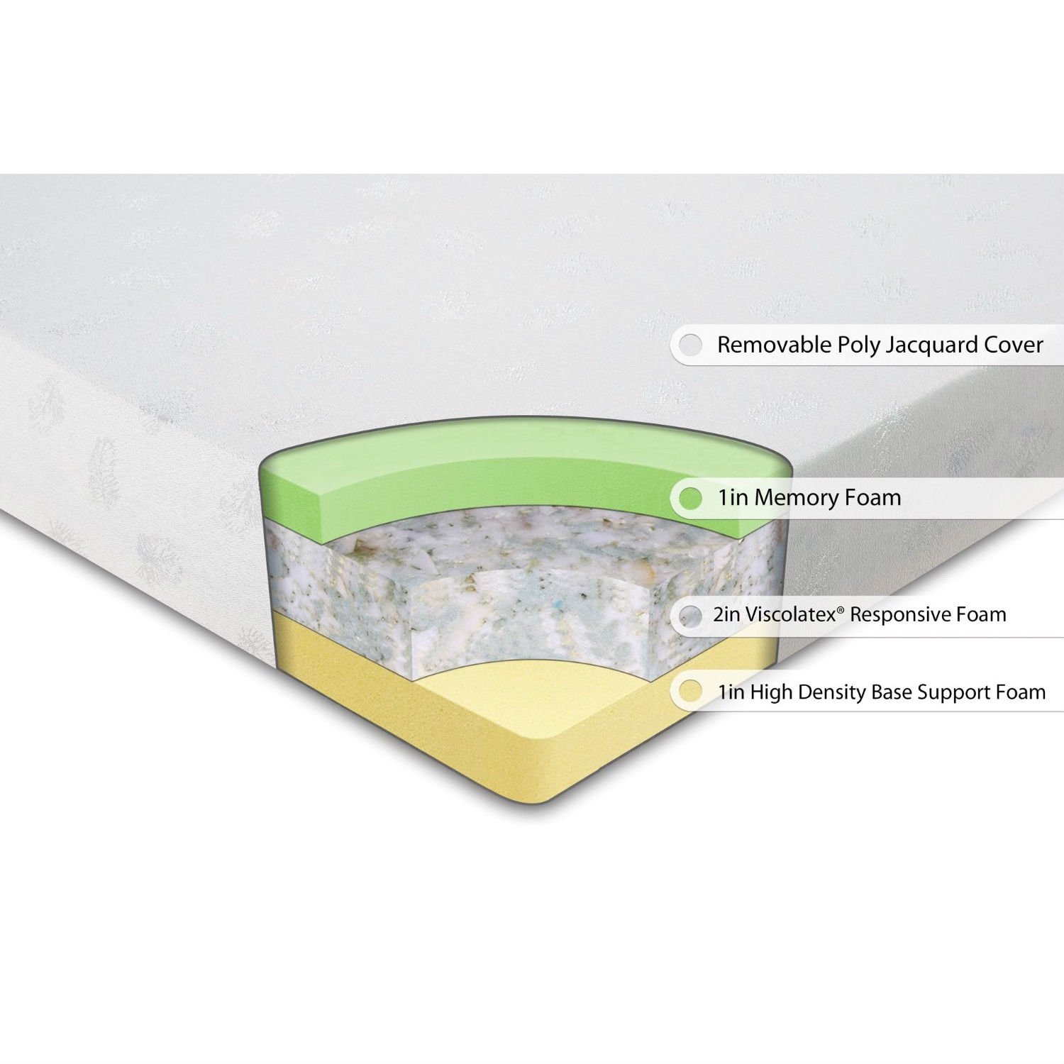 • Comfort and support from 1 inch Memory Foam, 2 inches Viscolatex Responsive Foam, 1 inch High-density Base Support Foam
