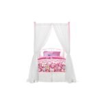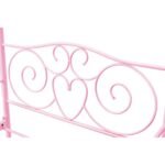 Make bedtime more enticing with this Twin size Sturdy Metal Canopy Bed in Pink. The embellished heart scroll design on both the headboard and footboard evoke an elegant, yet fun look to your princess’s room. The four canopy posts, topped with gracious finials add the finishing touches to this delicate piece. Highlight its beauty even more by placing sheer curtains over the posts. The layered effect creates a special place for your little girl to play and sleep. Designed to fit a standard twin mattress, this bed includes metal slats that eliminate the need of a box spring.